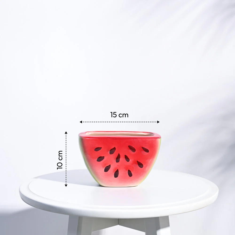 Bring home the summer quirk with this beautiful planter made of premium ceramic in beautiful colours resembling a watermelon. Your plant babies will love the drainage hole at the bottom while the beautiful glaze and embossed detailing will elevate their fun vibe. The shape is great for small spaces that need colour and life, after all watermelons are the coolest.